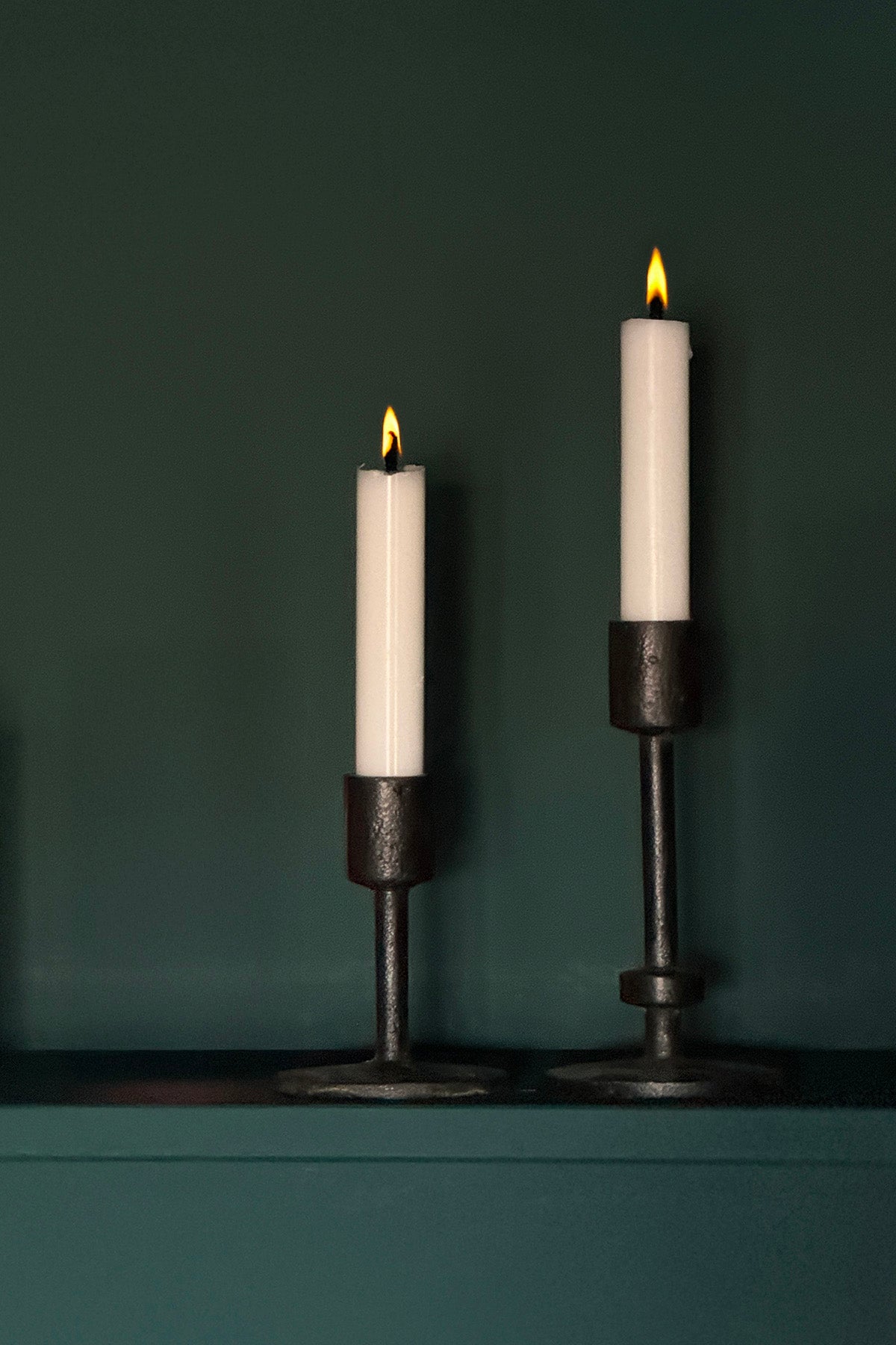 To styk støbejerns-lysestager.Størrelser: 10,5x15,5 cm8x8 cm