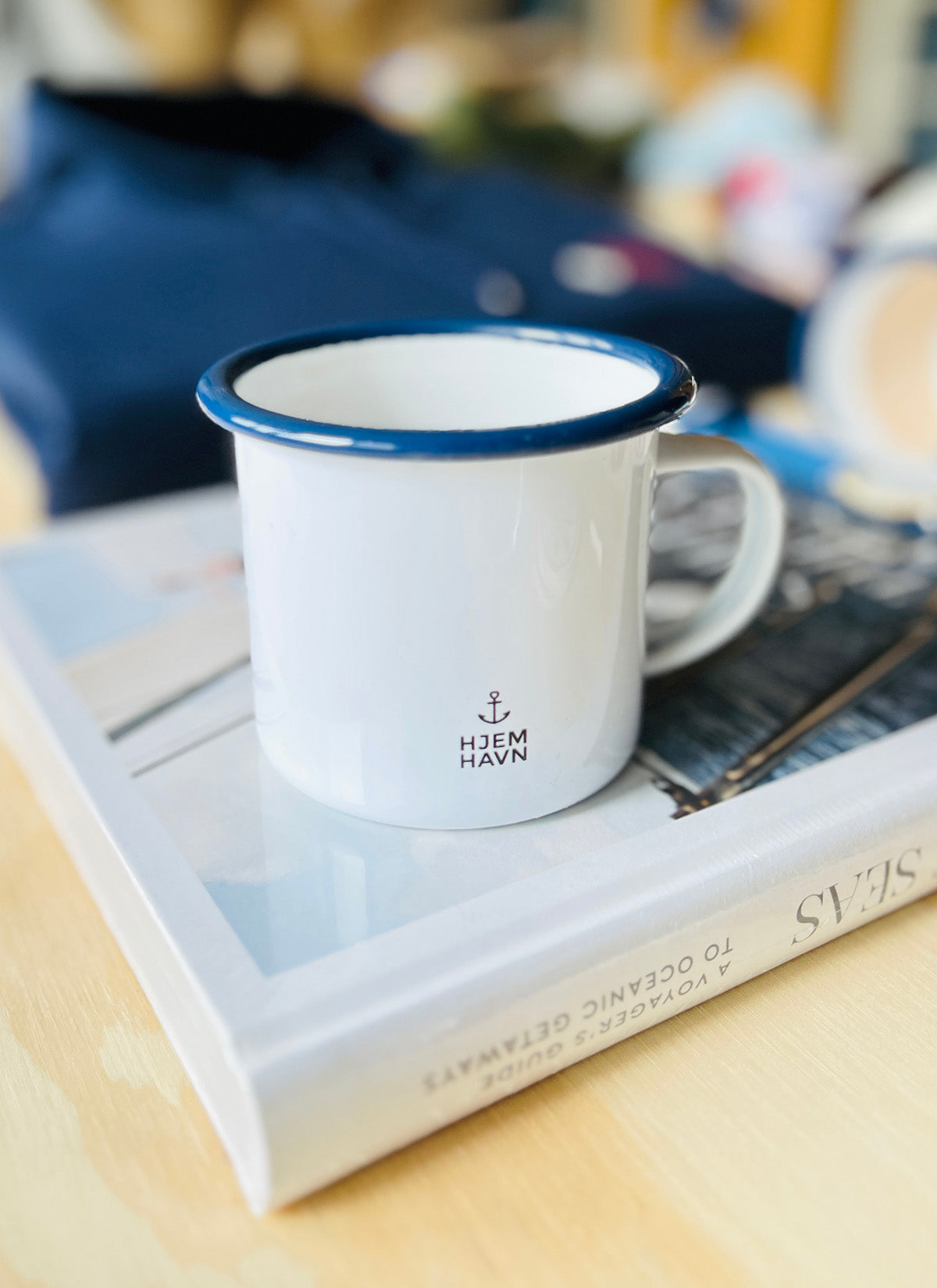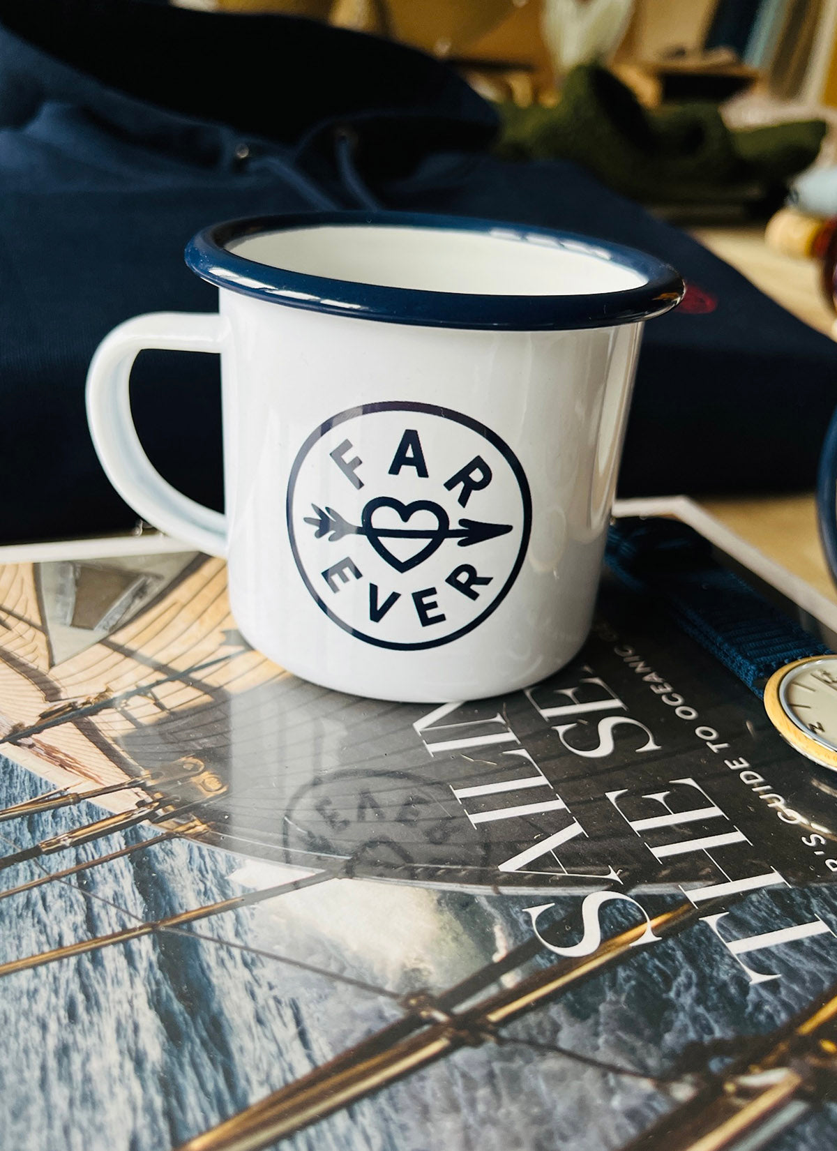 Emaljekrus med blå kant lavet i anledning af Fars Dags den 5. juni.