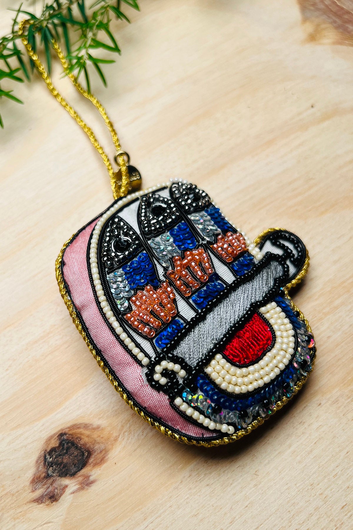 Hergestellt aus handgefärbten Glasperlen mit Metallschnur. Es ist auf beiden Seiten gleich bestickt.