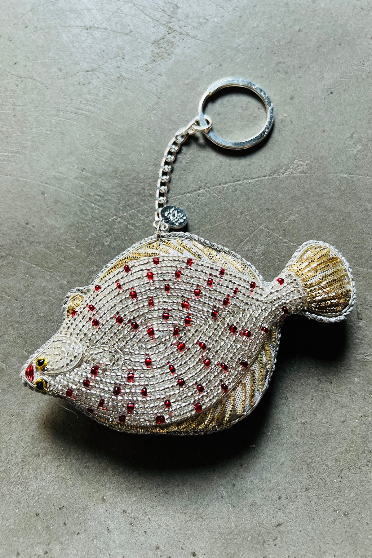 Handbestickte Schlüsselanhänger aus handgefärbten Perlen und Metallgarn.