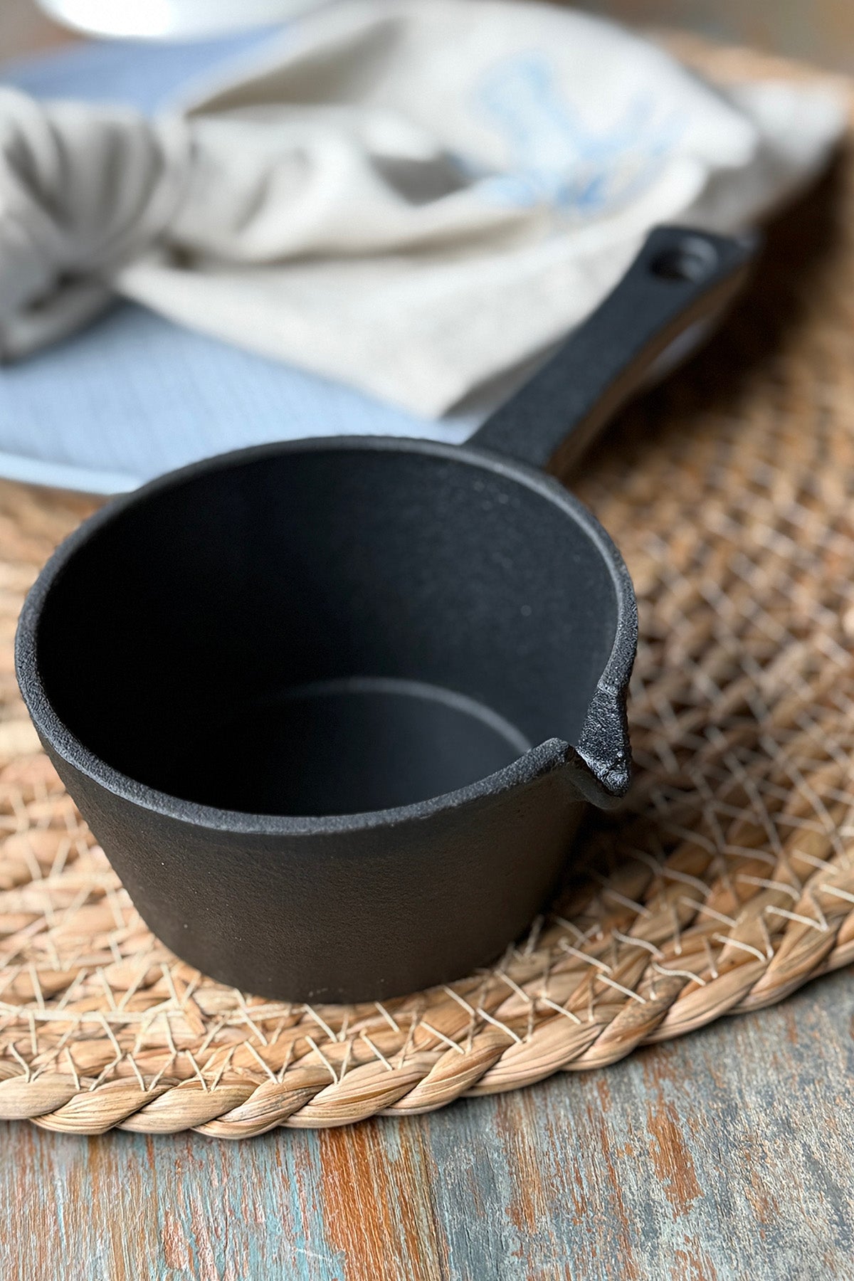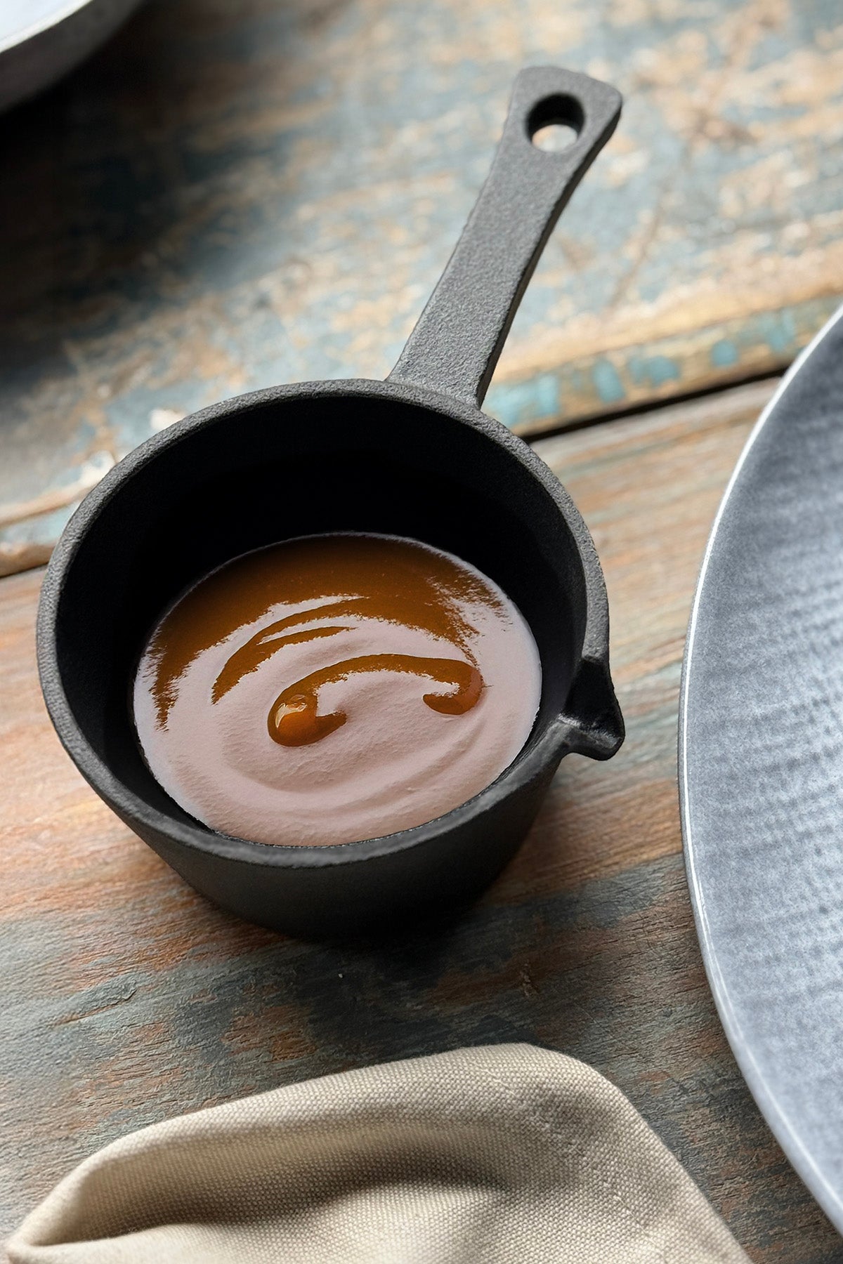Lille støbejernsgryde til sauce, snacks eller fingersalt – ideel til servering direkte på bordet.